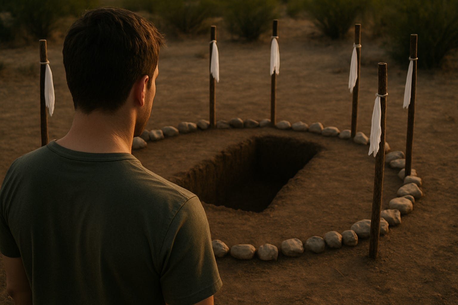 The spot was found. The ceremonial space prepared. Circle of stones laid out. Directions marked with natural objects. Prayer sticks planted at the edges of where my grave would soon be dug.