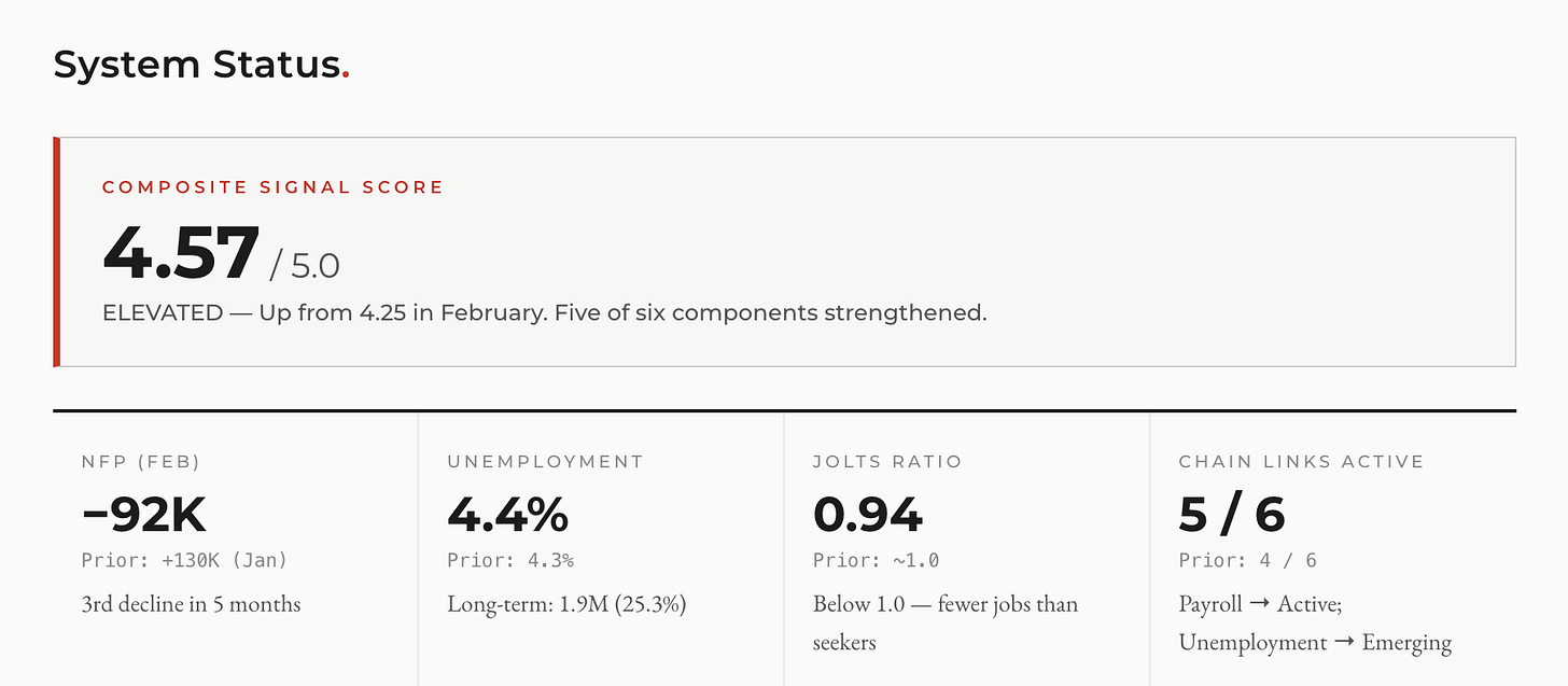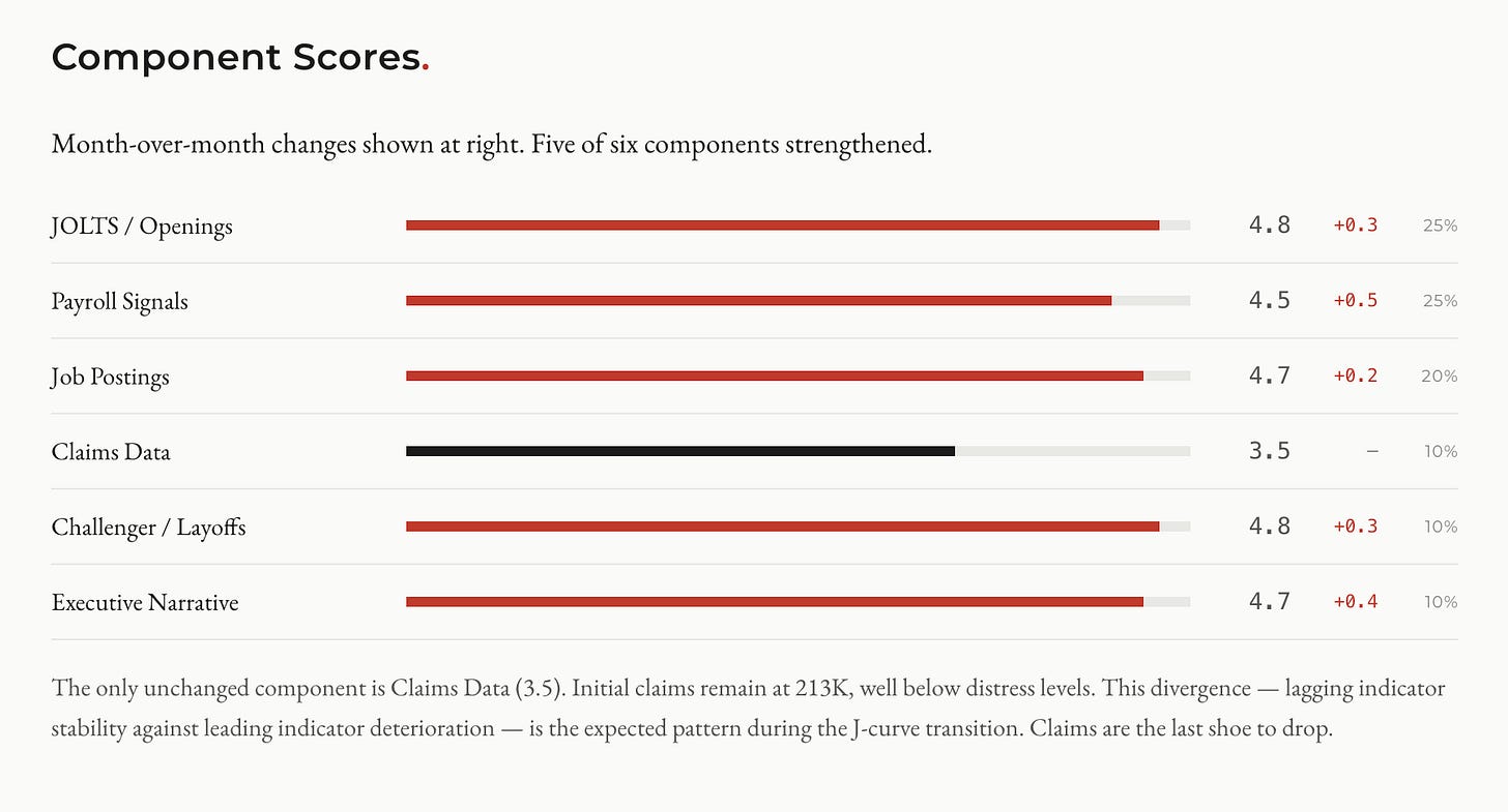 Five of six links are now active or emerging. The composite signal score across the six indicator categories we track (JOLTS, payroll, job postings, claims, layoffs, and executive narrative) moved from 4.25 to 4.57 out of 5.0. Five of six components strengthened. The only unchanged component is claims data, which remains stable at 213,000 initial claims weekly. Claims are the most lagging indicator in the set. They’re the last shoe to drop.