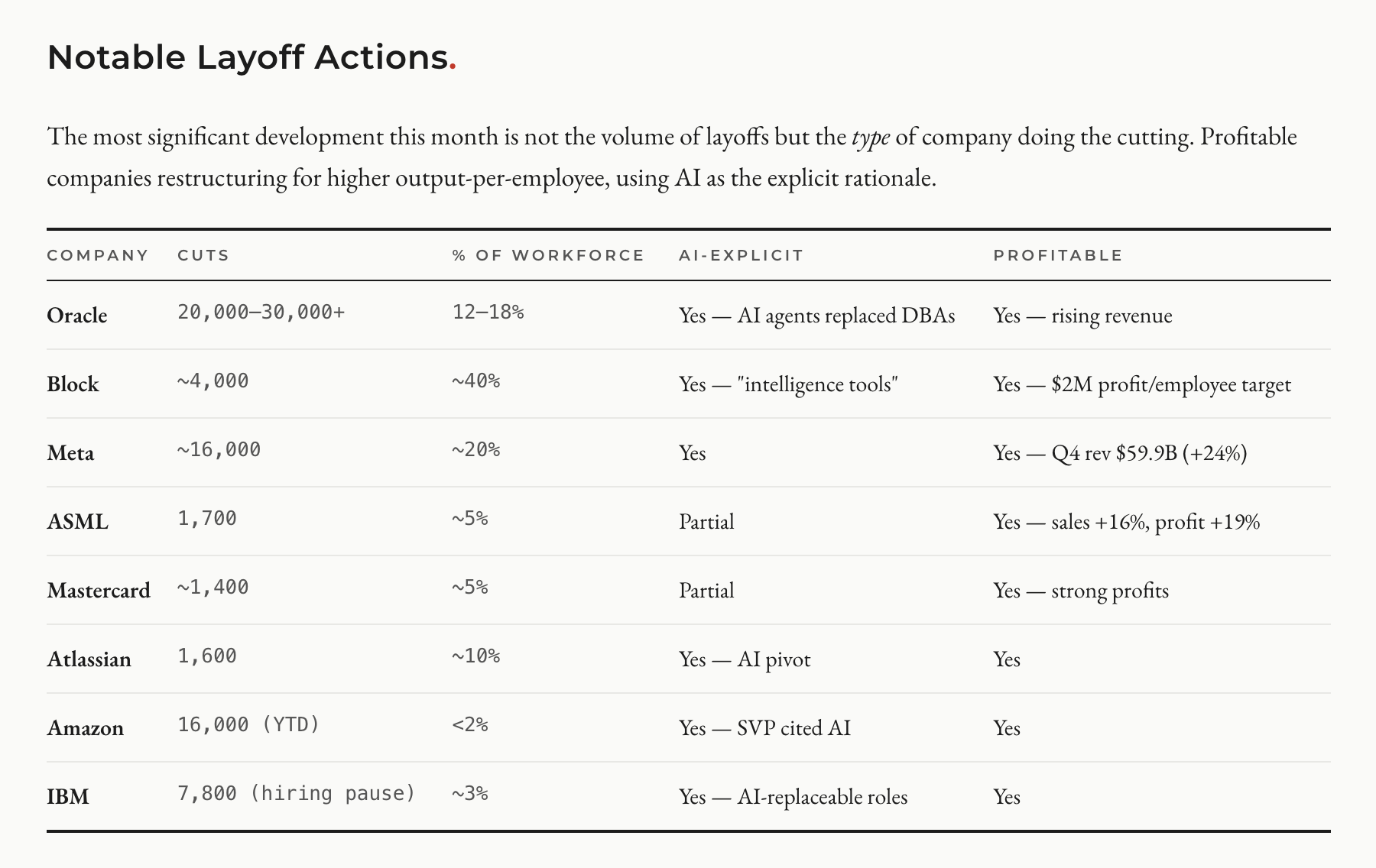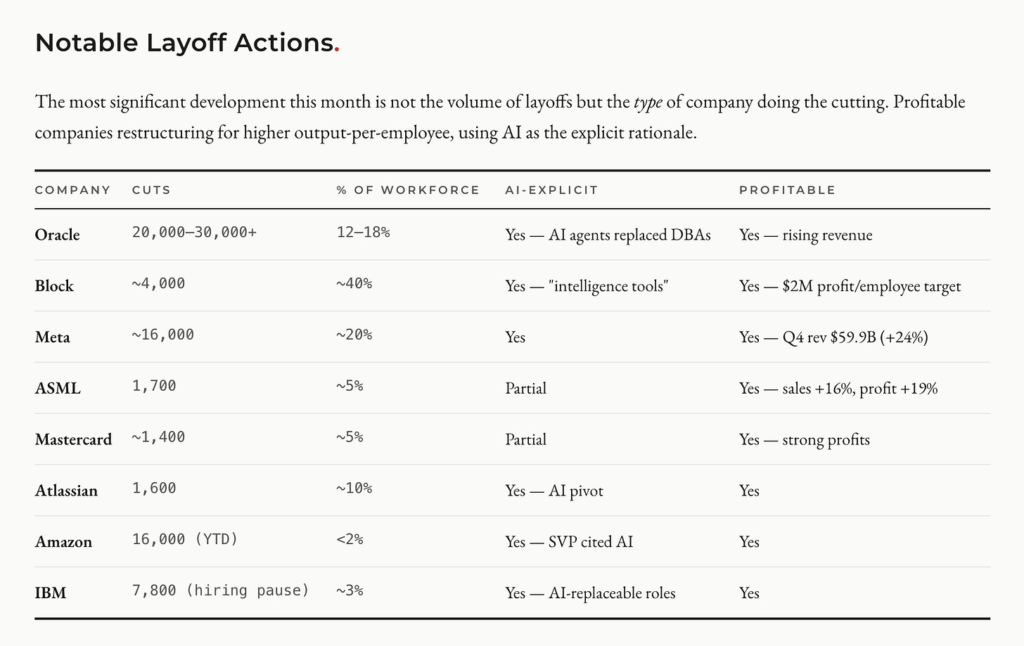 The window for proactive workforce restructuring through attrition is closing. IBM’s experience shows why: when workers stop leaving voluntarily, you lose the option to reshape your team quietly. The companies that are adjusting now (Block, Oracle, Atlassian) are doing it while they have the choice. The companies that wait will do it under more pressure and less control. Dorsey’s prediction (”within the next year, the majority of companies will reach the same conclusion”) is aggressive, but the direction is right.