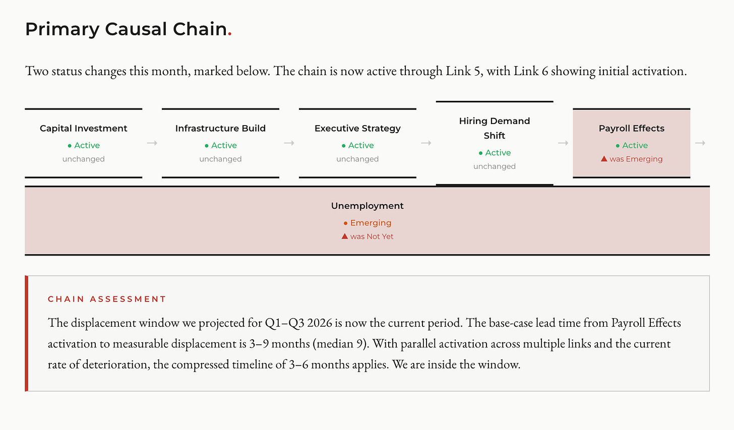 I’ve been tracking what I call the primary causal chain since last August. It maps six links that connect AI capital investment to measurable employment effects: