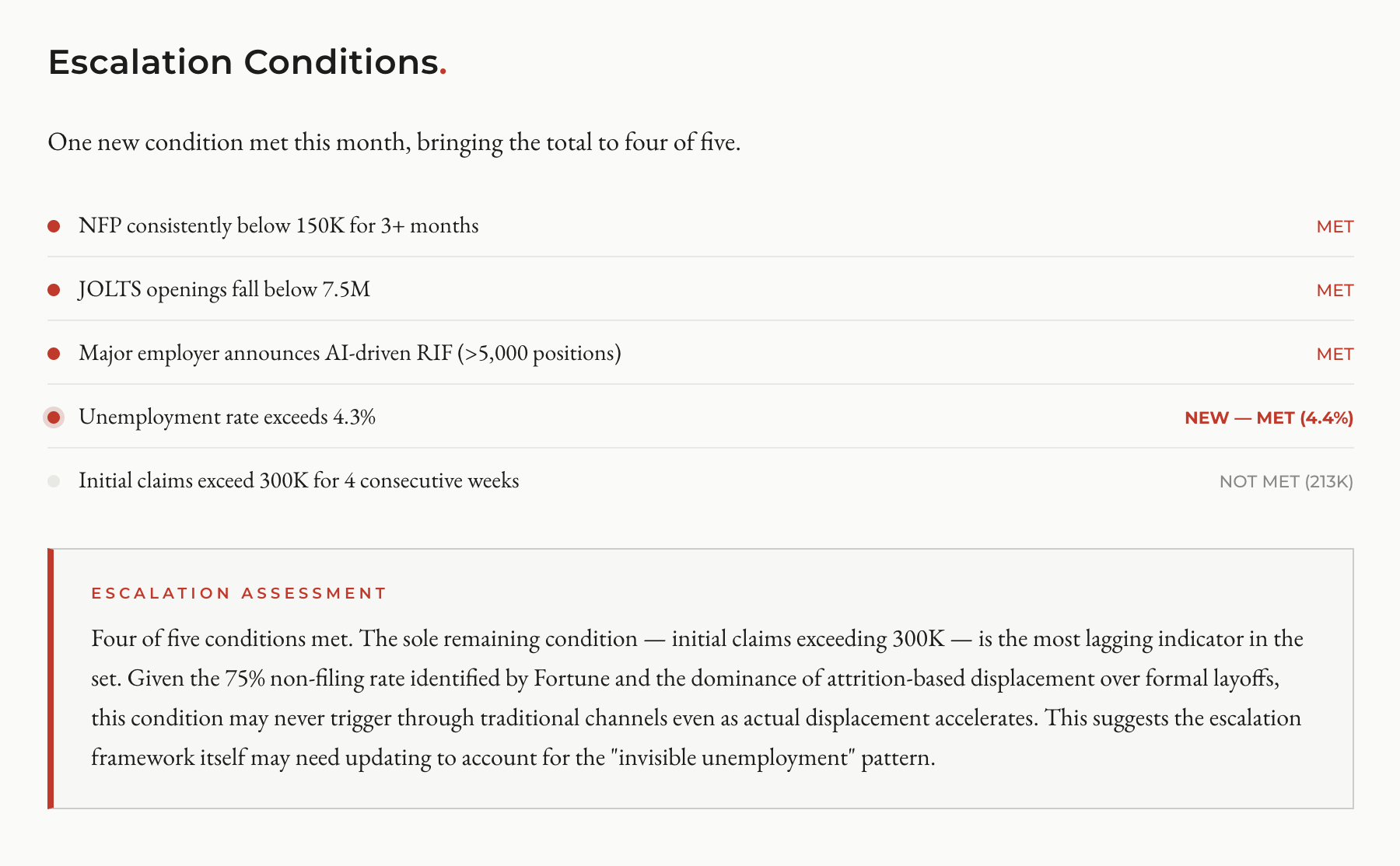 Four of five escalation conditions are met: NFP below 150K for 3+ months, JOLTS below 7.5M, a major employer announcing an AI-driven reduction exceeding 5,000 positions, and now the unemployment rate exceeding 4.3%. The sole remaining condition (initial claims exceeding 300K for four consecutive weeks) may be structurally incapable of triggering in this particular displacement, given the 75% non-filing rate and the dominance of attrition over formal layoffs.